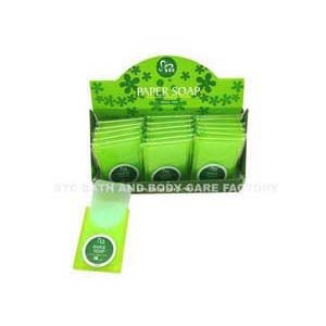10sheets of paper soap in a plastic box(Item#:ST102),24 boxes in a display box. Size:163x62x75mm |