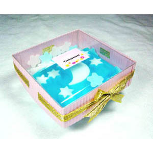 5 stars and moon design 10g confetti and 80g rectangular transparent soap in a pvc box Outer packing: QTY: 48pcsx3 G.W: 16.2 KG SIZE: 435x320x395mm |