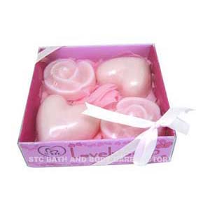 2pcs of 50g heart glycerine soaps + 2pcs of 25g rose shape glycerine soap +20g soap confetti noodles in a cardboard box with PVC lid. Size:120x120x35mm |