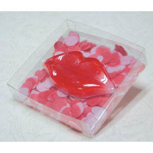 32g lips transparent soap and 15g confetti in a pvc box Outer packing: QTY: 48pcsx2 G.W: 9KG SIZE: 445x330x280mm |
